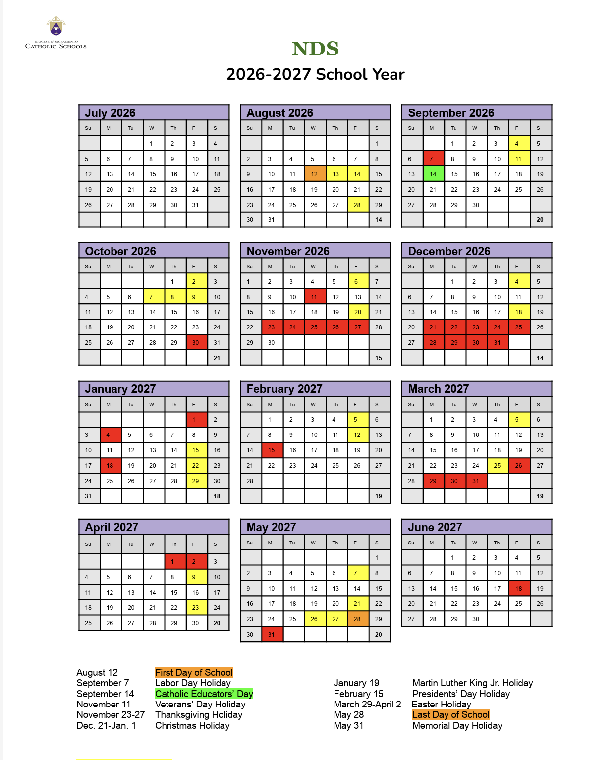 About NDS Mission/Philosophy Principal's Message Parents Handbook Time, Talent, Treasure Form Extension Registration Form and Pricing Handbook forms for signatures 2026-2027 School Calendar Parent Teacher Guild Faculty & Staff Events F.A.N.T.A.S.Y. Harvest Festival Accreditation Academics Transitional Kindergarten Kindergarten Elementary Middle School Enrichment Support Services Technology Student Life Student Council Athletics Choir NDS Times~Notre Dame's Student Created Newspaper Drama Robotics Academic Decathlon Fire Foundation Our Faith Family Mass Prayer Service Service Projects St. Joseph Catholic Church St. Mary Catholic Church Religious Formation St. Patrick-St. Vincent Catholic High School Activities Education in Virtue Sacraments Confirmation Admission Application Tuition Click Here to Apply Parent Teacher Guild Parent Teacher Guild Information Dine and Donate Script F.A.N.T.A.S.Y. Harvest Festival Charitable Giving Charitable Bequest Charitable Gift Annuity Endowment Gift Remembering Notre Dame in your Will Alumni Alumni Updates and Forms Contact Us FACTS Family Portal Click Here to Apply