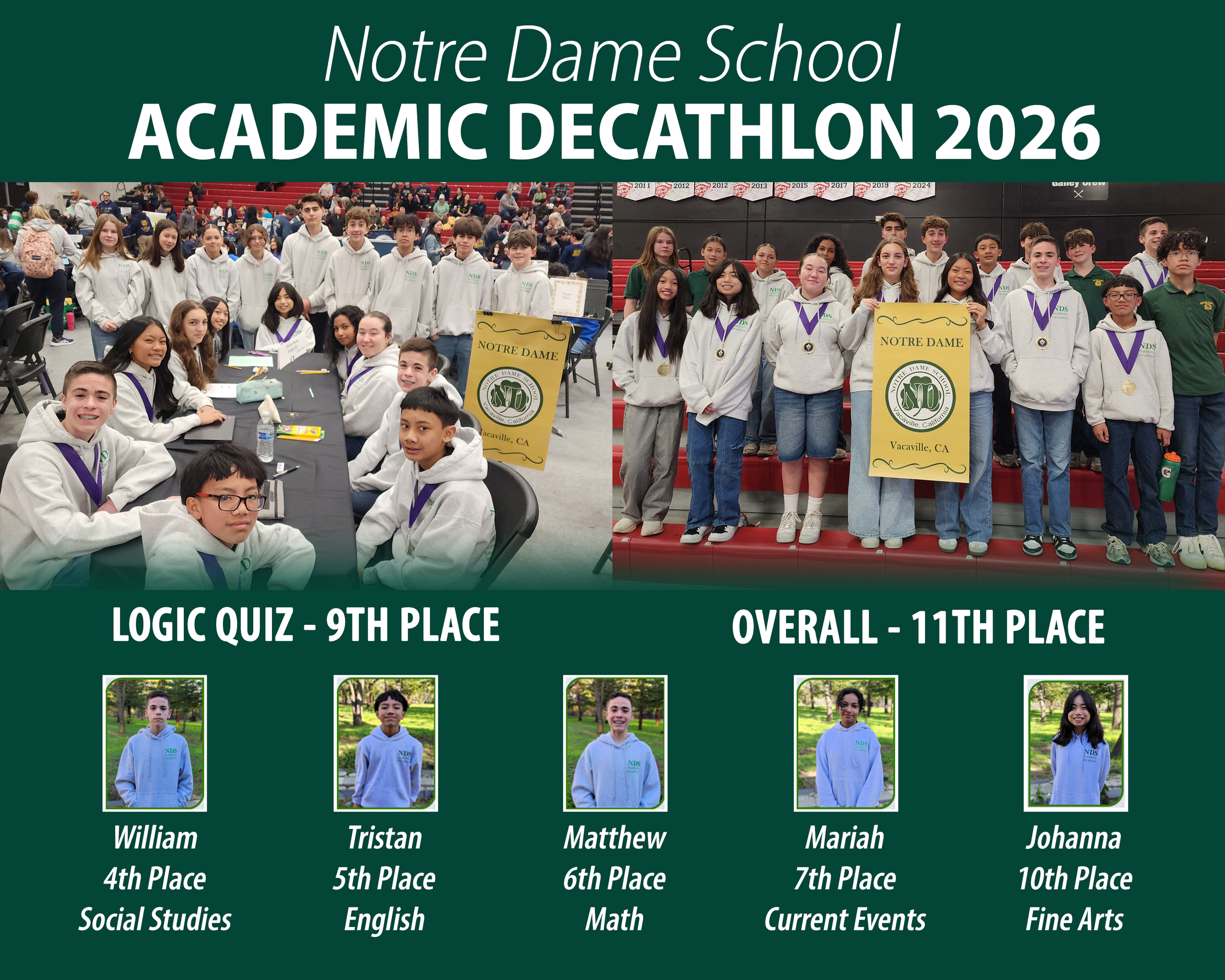 The Academic Junior High Decathlon is an academic competition designed for students in grades 6-8. There are ten events that take place within the one-day competition. Two are collaborative team efforts – a logic quiz with 20 rigorous thinking problems, and a super quiz with 50 multiple choice questions on five broad academic themes. The other eight events are individual events including Religion, English, Literature, Science, Mathematics, Current Events, Social Studies, and Fine Arts. The ten team members work together on both the Logic Quiz and the Super Quiz. There are eight team members who also take individual tests and two team members designated as the Members at Large who only compete in the team events. There will also be a set of alternates who will prepare for the competition as well.