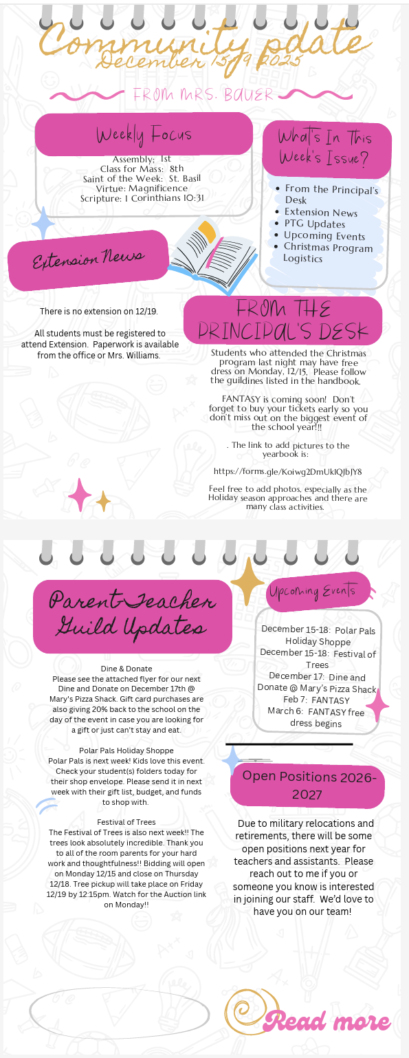 About NDS Mission/Philosophy Principal's Message Parents Handbook Time, Talent, Treasure Form Handbook forms for signatures Extension Registration Form and Pricing Parent Teacher Guild Faculty & Staff Events F.A.N.T.A.S.Y. Harvest Festival Accreditation Academics Transitional Kindergarten Kindergarten Elementary Middle School Enrichment Support Services Technology Student Life Student Council Athletics Choir NDS Times~Notre Dame's Student Created Newspaper Drama Robotics Academic Decathlon Fire Foundation Our Faith Family Mass Prayer Service Service Projects St. Joseph Catholic Church St. Mary Catholic Church Religious Formation St. Patrick-St. Vincent Catholic High School Activities Education in Virtue Sacraments Confirmation Admission Tuition Parent Teacher Guild Parent Teacher Guild Information Dine and Donate Script F.A.N.T.A.S.Y. Harvest Festival Charitable Giving Charitable Bequest Charitable Gift Annuity Endowment Gift Remembering Notre Dame in your Will Alumni Alumni Updates and Forms Contact Us FACTS Family Portal