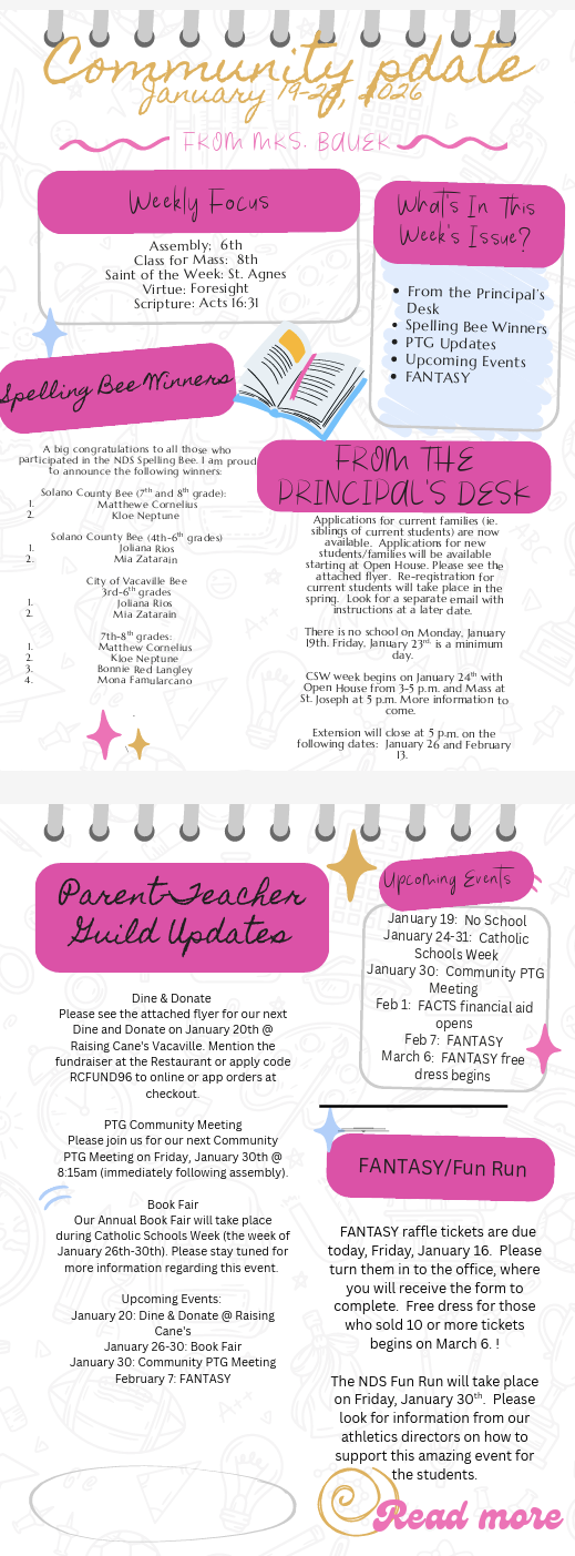 About NDS Mission/Philosophy Principal's Message Parents Handbook Time, Talent, Treasure Form Handbook forms for signatures Extension Registration Form and Pricing Parent Teacher Guild Faculty & Staff Events F.A.N.T.A.S.Y. Harvest Festival Accreditation Academics Transitional Kindergarten Kindergarten Elementary Middle School Enrichment Support Services Technology Student Life Student Council Athletics Choir NDS Times~Notre Dame's Student Created Newspaper Drama Robotics Academic Decathlon Fire Foundation Our Faith Family Mass Prayer Service Service Projects St. Joseph Catholic Church St. Mary Catholic Church Religious Formation St. Patrick-St. Vincent Catholic High School Activities Education in Virtue Sacraments Confirmation Admission Tuition Parent Teacher Guild Parent Teacher Guild Information Dine and Donate Script F.A.N.T.A.S.Y. Harvest Festival Charitable Giving Charitable Bequest Charitable Gift Annuity Endowment Gift Remembering Notre Dame in your Will Alumni Alumni Updates and Forms Contact Us FACTS Family Portal