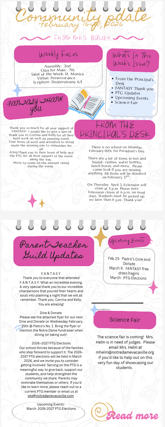 About NDS Mission/Philosophy Principal's Message Parents Handbook Time, Talent, Treasure Form Extension Registration Form and Pricing Handbook forms for signatures Parent Teacher Guild Faculty & Staff Events F.A.N.T.A.S.Y. Harvest Festival Accreditation Academics Transitional Kindergarten Kindergarten Elementary Middle School Enrichment Support Services Technology Student Life Student Council Athletics Choir NDS Times~Notre Dame's Student Created Newspaper Drama Robotics Academic Decathlon Fire Foundation Our Faith Family Mass Prayer Service Service Projects St. Joseph Catholic Church St. Mary Catholic Church Religious Formation St. Patrick-St. Vincent Catholic High School Activities Education in Virtue Sacraments Confirmation Admission Application Tuition Click Here to Apply Parent Teacher Guild Parent Teacher Guild Information Dine and Donate Script F.A.N.T.A.S.Y. Harvest Festival Charitable Giving Charitable Bequest Charitable Gift Annuity Endowment Gift Remembering Notre Dame in your Will Alumni Alumni Updates and Forms Contact Us FACTS Family Portal Click Here to Apply